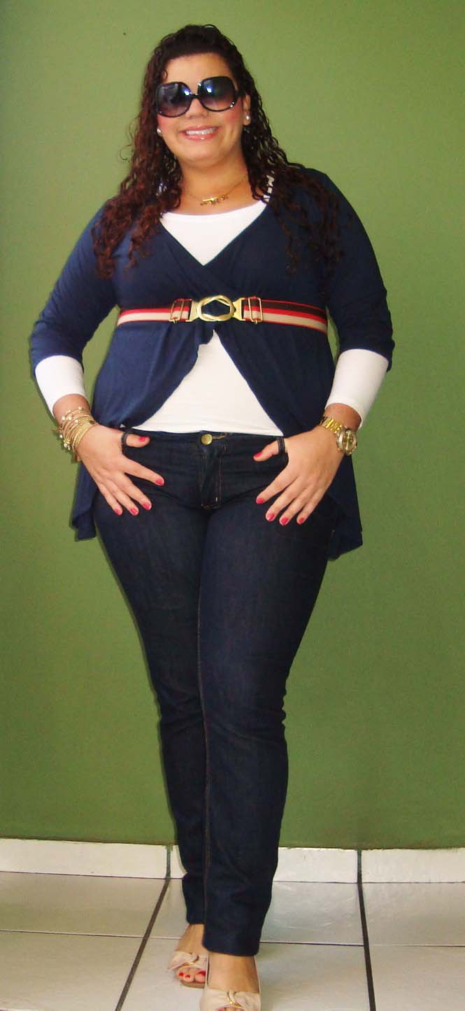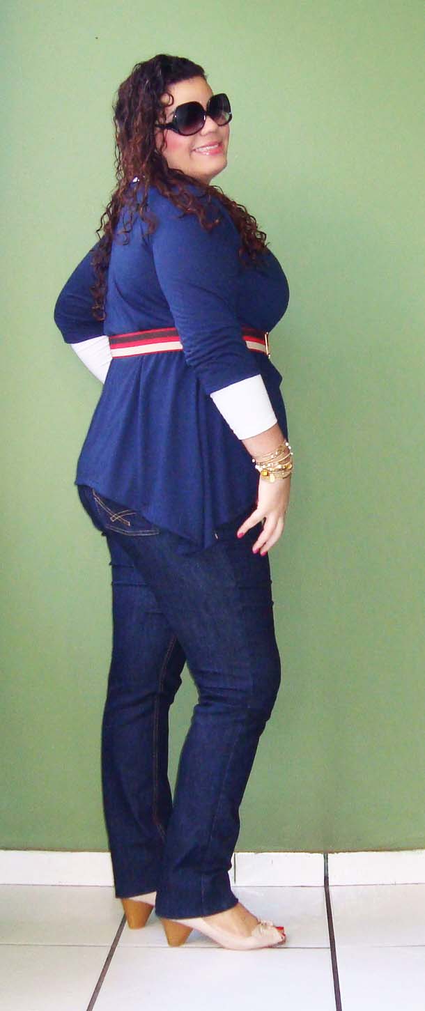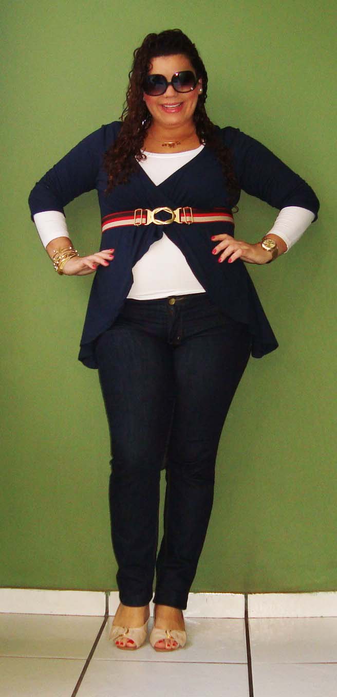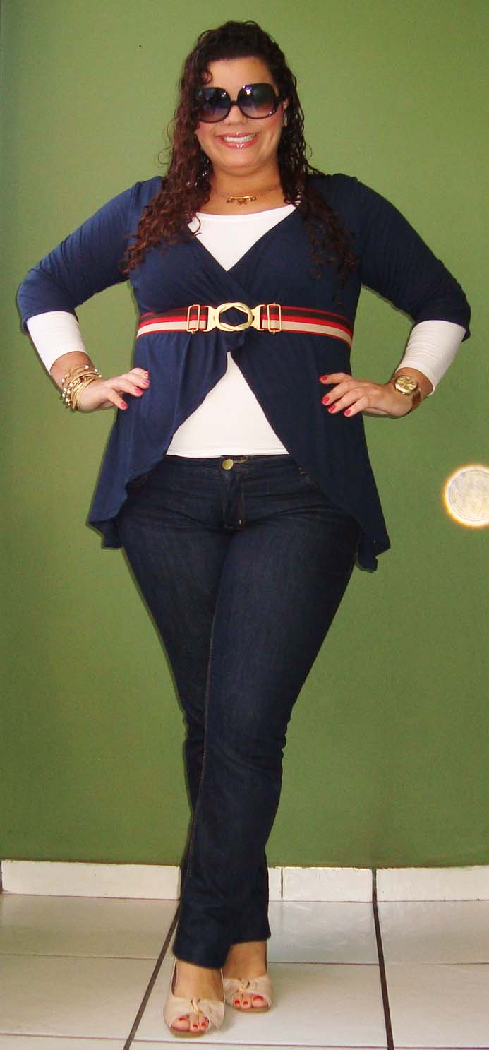 Meninas, olha como roupa larga demais engorda! Percebam que sem o casaquinho, a blusa me engordou mais. O casaquinho delimitou um pouco a minha barriga, tirando o excesso que a blusa proporcionou. Apesar disso, eu amei essa blusa, mas pretendo usá-la com casaquinhos e coletes.