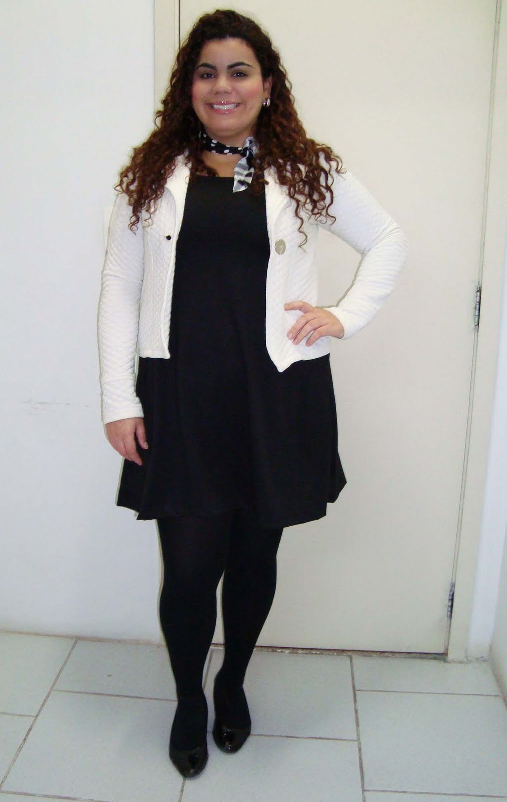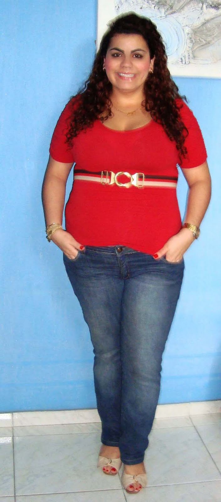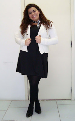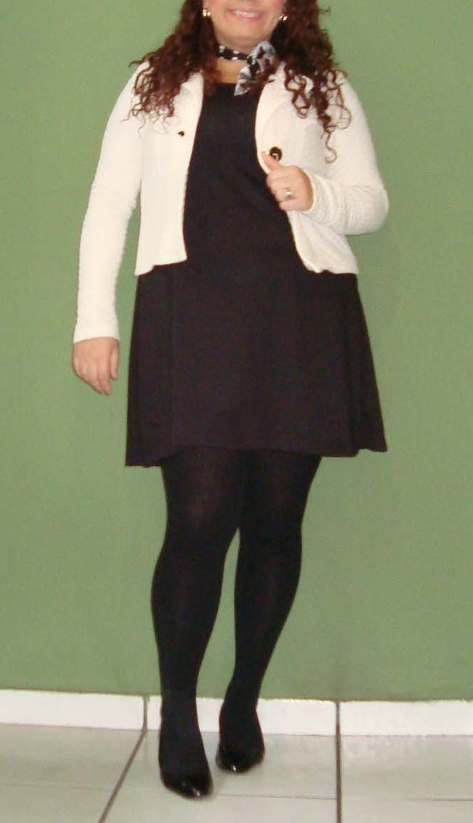 Meninas, olha como roupa larga demais engorda! Percebam que sem o casaquinho, a blusa me engordou mais. O casaquinho delimitou um pouco a minha barriga, tirando o excesso que a blusa proporcionou. Apesar disso, eu amei essa blusa, mas pretendo usá-la com casaquinhos e coletes.