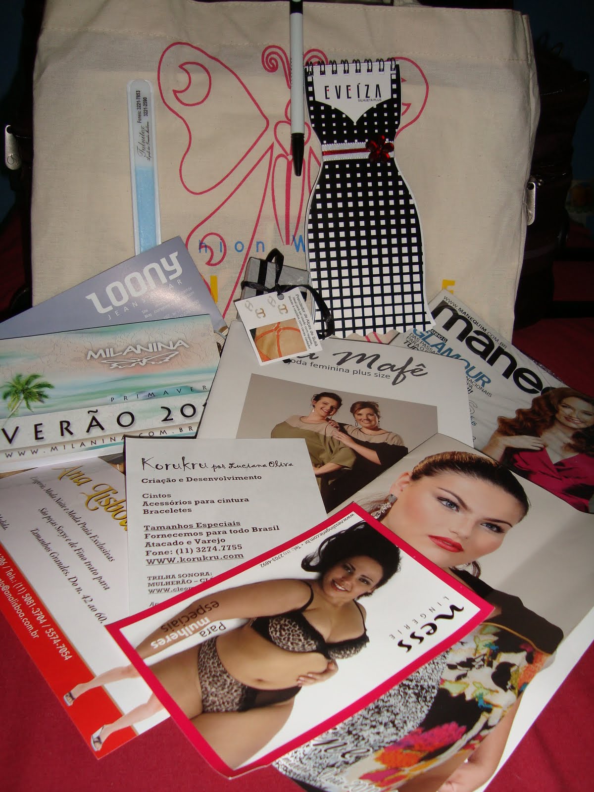 Bom, primeiramente, deixo aqui registrada a fofíssima ecobag que ganhamos do evento, com alguns brindes, revistas e muita dica de moda GG: